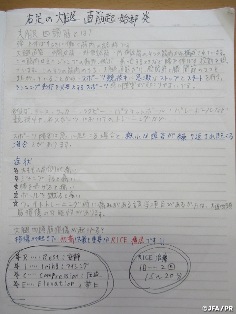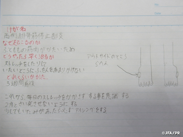 怪我についての知識を学ぶ取り組みとして、傷害ノートを作成しています。傷害ノートとは、自分が受傷した怪我について、病院受診で医師から聞いた情報や、自分で怪我について調べたことを整理してノートにまとめたものです。このような取り組みを行うことで、「怪我をした原因はなにか?体のどの部分を怪我したのか?どうすれば早く治るのか?」などを医師やトレーナーから教わるだけでなく、選手自身が調べてノートにまとめることで、より怪我についての知識を学ぶことに繋がります。この結果、怪我をした時の応急処置や、復帰後に怪我の再発や予防のためのアイシングやストレッチなど、自主的に取り組む選手が増えてきました。