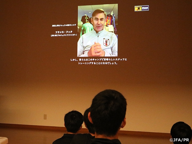 夜のミーティングでは、JFA GKプロジェクトリーダーの川俣則幸コーチが、このキャンプの狙いや目的、目指すべき目標、またそこに向かうためにはどうする必要があるのか等について熱量をもって話しました。また、JFA GKプロジェクト テクニカルアドバイザーのフランス・フック(Frans Hoek)氏からもビデオメッセージをいただき、世界トップを走るフロントランナーの言葉に選手たちは目を輝かせながら聞き入っていました。選手たちは、その日の自分たちのトレーニングでの気づきやコーチからのアドバイスと照らし合わせながら翌日のトレーニングに臨めるよう、テクニックの重要性を再認識していたようでした。