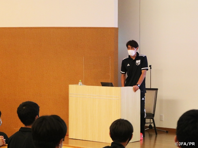 さらに、本年度より、JFAコーチとしてGKプロジェクトに参画している楢崎正剛コーチからも、選手たちへ向けて自身の経験を踏まえて、選手たちに期待すること、日々の生活での意識の重要性に関するレクチャーも行われました。ナショナルGKキャンプにも初参加となる楢崎コーチの話は、日本代表としてFIFAワールドカップでもプレーしてきた経験から重みが感じられ、選手たちにも大きな刺激となったようでした。