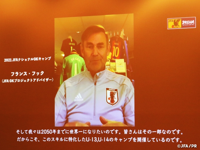 まずオープニングでは、GKプロジェクトのプロジェクトリーダーである川俣則幸コーチがこのキャンプの狙い・目的、また目指すべき目標、そこに向かうためにはどうしていく必要があるのかについて熱量をもって伝えました。また、JFA GKプロジェクト テクニカルアドバイザーのフランス・フック(Frans Hoek)氏からもビデオメッセージをいただきました。マンチェスターユナイテッドやバルセロナでコーチを経験し、また現在もオランダ代表のコーチを務め、世界トップのフロントランナーの言葉に選手たちは目を輝かせながら聞き入っていました。