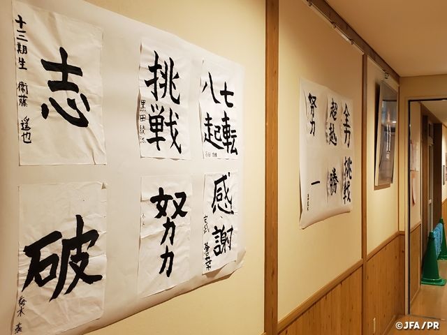 新年を迎え、アカデミー寮内には書初めが掲示されています。正月は日本の文化や伝統を学ぶ機会でもあることから、13期生(中学1年)が今年の抱負を言葉に表し目標成就を願って作成したものです。