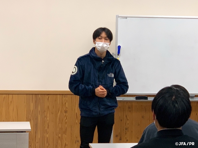 JFAアカデミー熊本宇城の卒校生の森田大智選手(8期生)がアカデミーを訪問してくれました。森田選手は先日行われた全国高校サッカー選手権大会で大津高校サッカー部のキャプテンとして準優勝に貢献し、国立のピッチで感じたこと、そしてアカデミー生活の思い出、これからの目標を話してくれました。アカデミー生に向けて「常に夢や目標を持って生活することが大切」という言葉を残してくれました。選手たちは先輩からの話を聞くことができ、とても良い刺激になったのではないでしょうか。アカデミー生がここで過ごした誇りを持ち、自信をもってこの先も夢に向かって頑張ってくれることを楽しみにしています。