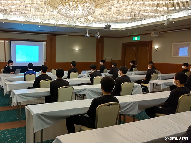 全国各地から集まった選手たちは、最初はかなりの緊張感がありましたが、オープニングミーティングでは、木村康彦監督から自分たちが目指すロードマップの提示があり(FIFA U-17ワールドカップやFIFA U-20ワールドカップ)、今回のキャンプテーマでもある「自分を知る」「味方を知る」「サッカーを知る」ことへの確認が行われました。