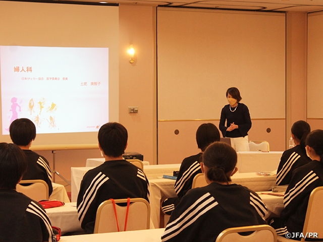 早速ピッチに立った選手たちは、フィジカル測定を実施するとともに選手同士コミュニケーションを取り合いました。夜のミーティングでは、なでしこジャパン(日本女子代表)/U-20日本女子代表の大塚慶輔フィジカルコーチによるレクチャーと測定のフィードバックがあり、それぞれが自分のフィジカル能力の特性や課題を再確認しました。2日目は午前・午後のトレーニングを行い、また、夜のミーティングでは、JFA医学委員会 土肥美智子委員を講師に迎えて婦人科のレクチャーを実施。自身の身体との向き合い方など、女性アスリートとして必要となる知識を得る時間となりました。3日目は午前にトレーニング、午後は千葉県トレセン女子U-16とのトレーニングゲームを実施しました。また、最終日は前日のトレーニングゲームの振り返りと、紅白戦を行いながら4日間の活動を締めくくりました。