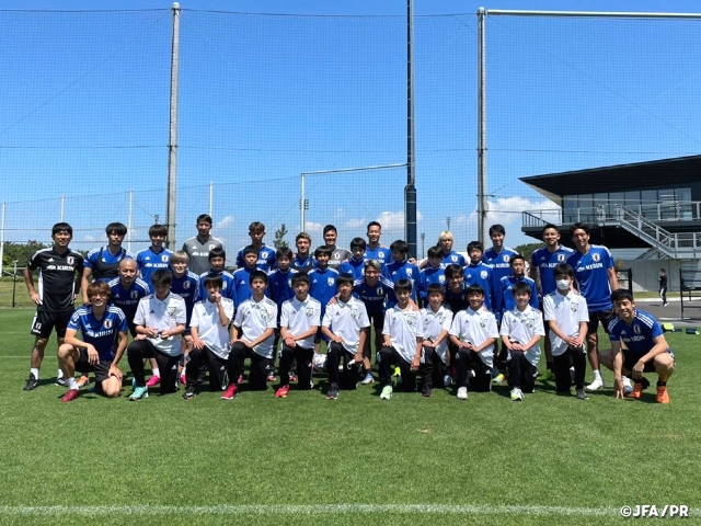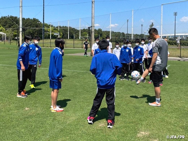 また、JFAアカデミーは今年度から高円宮記念JFA夢フィールドでトレーニングマッチを実施する機会を設けております。5月末に高円宮記念JFA夢フィールドで実施したトレーニングマッチの日は6月の活動に選出されたSAMURAI BLUEの海外に所属する選手たちも自主トレーニングを実施していたため、トレーニングマッチの合間にトレーニングを見学しました。