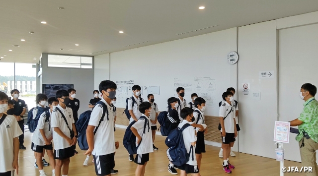 前週に開催された、今年度1回目のエリートプログラムU-13キャンプに続き、フューチャーキャンプが選手22名、スタッフ8名でJヴィレッジで開催されました。他の事業でも報告されているように、コロナウイルス感染症収束の見通しが立たない中、検査での陰性を確認し、宿泊もシングル対応で4泊5日の活動をスタートしました。今回選出された選手たちの年代はコロナ禍で集合型のキャンプなどの経験が少なく心配もありましたが、素晴らしい環境のピッチに立ってボールに触れるとともにどんどん緊張も解れ、元気にプレーしてくれていました。4泊5日のキャンプでは、4回のトレーニング、2回のトレーニングマッチと紅白戦、オフザピッチプログラムとして福島が復興に向き合ってきた「証」として2020年9月に開館した東日本大震災・原子力災害伝承館に出向き、ピッチ外での貴重な経験も積むことができました。また、全スタッフからはさまざまな視点から話をして、選手たちはメモを取りながら真剣に聞いていたのが印象的でした。フューチャープログラムに選出された選手は9月以降生まれの選手たちということで、比較的小柄な選手が多く参加しており、体力面や精神面での成長の差も多くある中、ボールを持ったときのテクニックの質や個人でアグレッシブにプレーする姿勢や意識は高かったですが、まわりを見て関わり、状況判断しながらプレーすることができれば更に個々のプレーの幅が広がり成長できると感じました。ただ、最終日の紅白戦では2回のトレーニングマッチの強度はなかったものの、毎日のトレーニングで積み上がったものは発揮され、攻守においてオフザボールの関わりが増えて質の高いプレーが多く見られ、吸収力の早さを感じることができました。本キャンプ参加にあたりご理解とご協力をいただきました、保護者の皆様・所属チームの皆様・各地域関係者の皆様には、この場を借りて厚くお礼申し上げます。