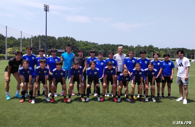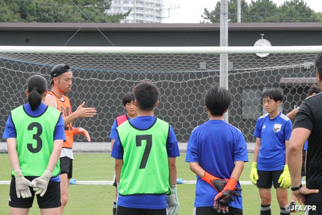 酷暑の中、そしてコロナ感染予防対策を講じながら様々な制限がある中でのキャンプとなりましたが、選手はトレーニングやミーティングにおいて積極的に取り組み、短い期間でしたが、選手の成長を感じられる3日間となりました。また、キャンプ期間中にJFA夢フィールドで自主トレーニングを行っていたSAMURAI BLUEの川島選手、吉田選手、南野選手、冨安選手、久保選手と交流する時間を作っていただき、特に川島選手には選手へのメッセージや様々な質問にも答えていただきました。そして、南野選手にはシュートを打っていただき、吉田選手にはクロスの守備のセッションでDFとして入っていただくなど、GKとDFの連係の大切さ、GKの「存在感」についての話もありました。JFA夢フィールドという素晴らしい環境の中、日本を代表して世界で戦う選手の貴重な話や一緒にプレーをする機会も作っていただき、選手にとってかけがえのない時間となり貴重な経験となりました。SAMURAI BLUEのみなさん、ありがとうございました。