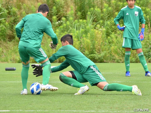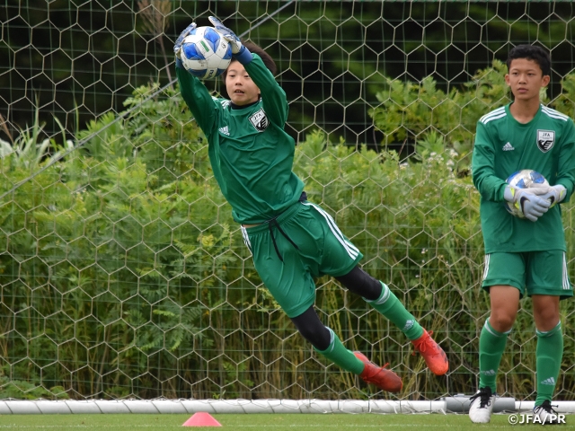 このキャンプはU-14/U-13年代におけるポジション別指導・育成というテーマのもと、将来の日本代表GK、世界一のGKの育成を目的に実施しています。トレーニングは選手3~4名対してGKコーチが1名つく形で個別性を重視したグループで、現在のGKに求められるテクニックの習得と向上を目的として実施されました。今年度は、第1回がU-14対象、第2回はU-13対象、10月に開催予定の第3回はU-14 10名、U-13 10名での実施を予定しています。