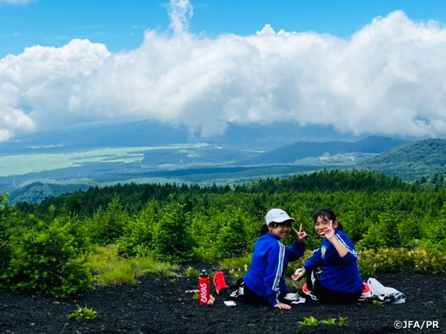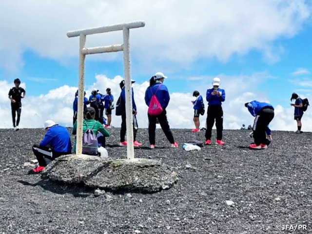 7月28日、JFAアカデミー福島女子の選手は、御殿場市と富士山ツーリズム御殿場実行委員会が主催する、富士山環境教育トレッキングに参加しました。学校の行き帰りなど、日頃からその美しい姿を見慣れている富士山ですが、実際に登るのは初めての選手が多く、その行程は厳しいものでしたが、自然の美しさ、眺望に心を動かされた様子でした。また、日本の象徴ともいえる富士山に実際に登り、この環境を自分たちの世代も守っていこうと思えたことは、選手たちにとって大きな収穫となりました。