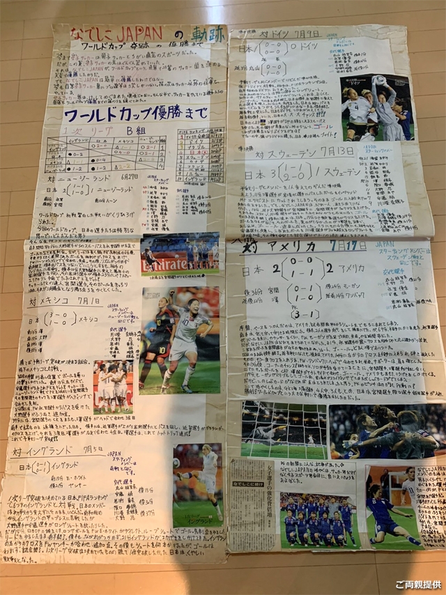 漠然とですが、なでしこリーグの選手になりたいと思っていたようです。吉本コーチへの憧れが強かったので、サッカーを始めた頃から選手になりたいと思っていたようですし、2011年のFIFA女子ワールドカップでなでしこジャパンが優勝した時は、夏休みの自由課題で優勝の記事を模造紙2枚に書いて作っていたので、なでしこジャパンへの憧れもあったと思います。