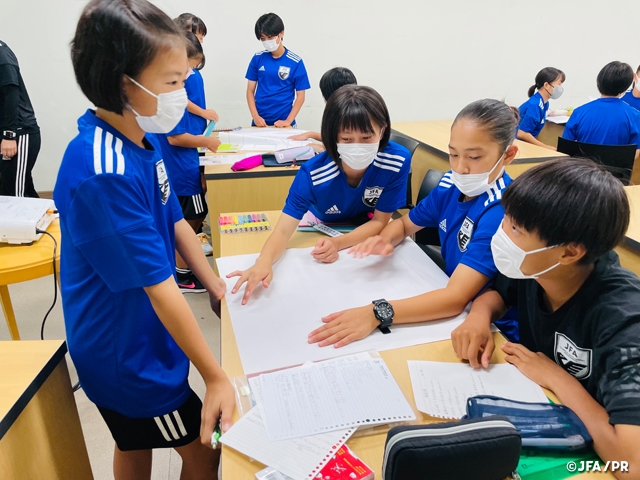 2日目には、「ゴールを奪う」という攻撃のテーマ、「ボールを奪う」守備のテーマで午前・午後のトレーニングに加え、オフザピッチでは、韓国の文化やサッカーについて各自調べてきた内容をグループごとにまとめて発表をしました。