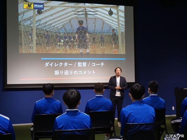 解散前の全体ミーティングでは、活動期間の2日間とも視察に足を運んだフットサル日本代表の木暮賢一郎監督(兼U-20フットサル日本代表監督)が選手たちに優勝したAFCフットサルアジアカップ2022で黒本ギレルメ選手(立川アスレティックFC)が大会最優秀GKを獲得したこと、日本代表のGK陣がどのような姿勢で大会に臨んでいたかなどを伝えながら、若い選手たちに激励のメッセージを送りました。最後に内山コーチより日本を代表するGKになるために求められる振る舞いや選手に求められている要素について振り返り、「謙虚」と「自立」を忘れずに所属クラブに戻ってからも日々取り組んでほしいと伝えられて2日間のキャンプが幕を下ろしました。