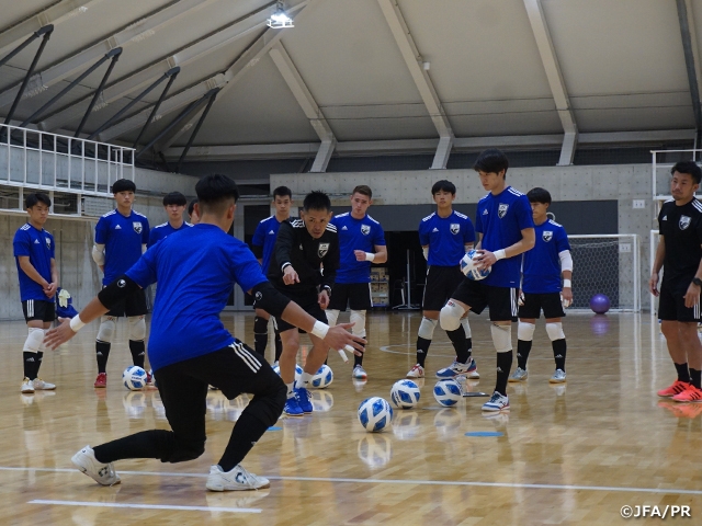 オープニングでは団長の小森隆弘氏(フットサル育成ダイレクター)より、この活動に招集されていることの意味や選手たちに2日間を通して感じてほしいことが伝えられ、その後に内山コーチから現代のフットサルで求められるGKの資質や良いプレーを発揮するための「準備」の重要性が説かれ、メモを取りながら熱心に話を聞いた選手たちは気合十分に最初のトレーニングに臨みました。