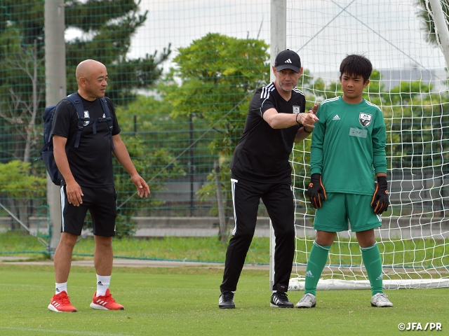 トレーニングは昨年度に引き続き、常にゲームシチュエーションを想定しながら、この年代で身につけておかなければならないゴールプレーヤー(GP)※ のテクニック習得を目的に実施されました。各選手の課題が異なる中、それぞれの選手の個別性に考慮してトレーニングを行うことで、選手に最大限の刺激を与えることを目的としています。トレーニングセッションごとにJFA GKプロジェクト テクニカルアドバイザーであるフランス・フック氏(前オランダ代表 GKコーチ)も含めてコーチングスタッフでディスカッションを行いながら、フランス・フック氏のGP育成のヴィジョンとメソッドを最大限生かして目の前の選手に即したトレーニングを計画し実施しました。