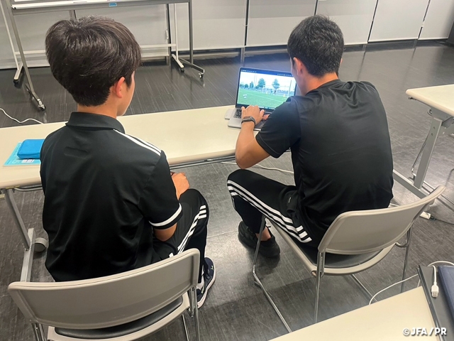 2日目には、フィジカルフィットネスプロジェクトリーダーの菅野淳氏が、フィジカル測定、ムーブメントプレパレーションを指導。フィジカル面、コンディショニングについて自チームに戻っても取り組めるメニューが提示され、選手は早速取り組み、大きな刺激を得ていました。またアスレティックトレーナーの服部祐介氏から身体の操作性・柔軟性の向上を目的としたストレッチの指導が行われました。