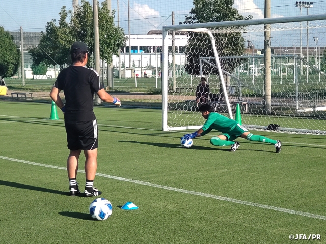 2日目の14日(木)午前はフィジカル測定を行い、その後のトレーニングは守備「チャレンジ&カバー」をテーマに、午後は攻撃「ビルドアップ」をテーマに取り組みました。夜のミーティングでは菅野淳コーチが「日本代表として世界と戦うために」についてレクチャーを行いました。