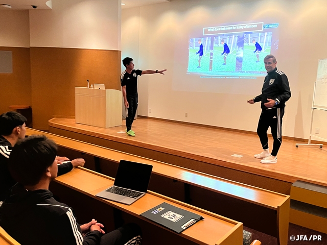 1日目の夕食後の夜のミーティングセッションでは、JFAGPプロジェクトのアドバイザーであるフランス・フック氏から、「How to reach the top Level」のレクチャーが行われました。選手たちは世界のトップレベルを知るフランス・フック氏の言葉に懸命に耳を傾け、世界のトップレベルに到達するために何が必要なのかを知る貴重な機会となりました。2日目の夜のミーティングセッションでは、映像分析スタッフによって編集された自身のトレーニング映像を用いた個人ビデオフィードバックのミーティングも行われ、選手たちはピッチ内外でGPとして成長するための濃密な時間を過ごしました。