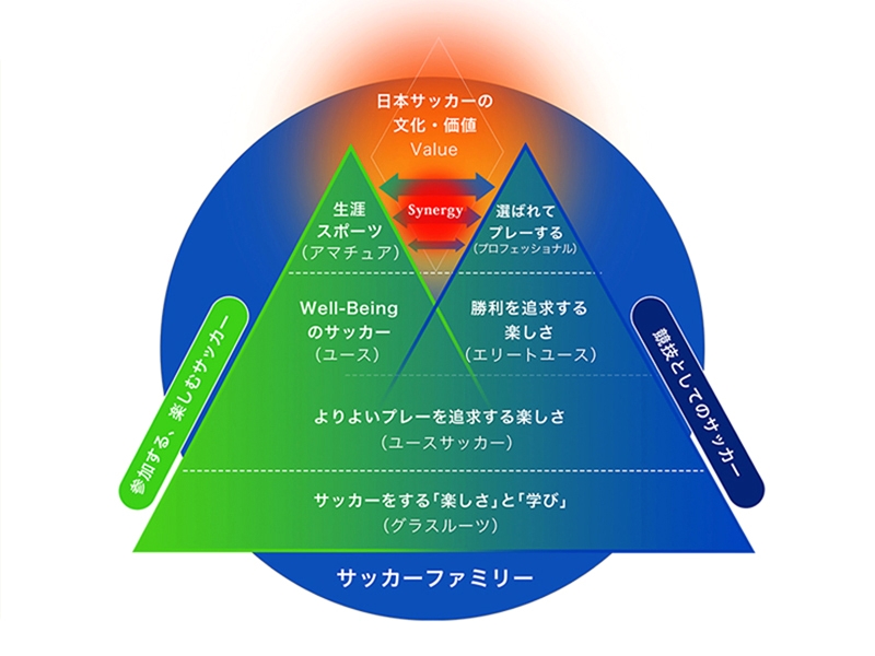 「ナショナル・フットボール・フィロソフィーとしてのJapan's Way」では、「参加する、楽しむサッカー」(左側の山)と「競技としてのサッカー」(右側の山)のダブルピラミッドを掲げています。この2つのすそ野を広く、そして高くしていくべきです。世界で活躍できる選手を育てることは大事ですが、サッカーを楽しむ選手を増やしていくことも、同じくらい大切だと認識しています。