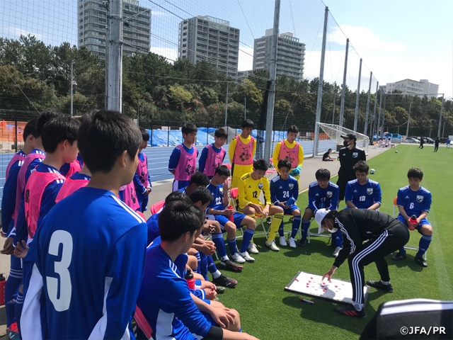 「自分を知る、チームメイトを知る、サッカーを知る」というテーマで3回のトレーニングセッションと2試合を行いました。同級生の鹿島アントラーズジュニアユースさんに8-2で勝利しましたが、最終日の日体大柏高校さんには、40分3本で試合を行い、3本目20分過ぎまで3-1でリードしていましたが、終盤に失速して3失点し逆転負けを喫してしまいました。しかし、これから立ち上がるU-15日本代表に複数人が絡んでくるのではないかと思われるほど選手のレベルが高く、選手の吸収しようとする意志、意欲も非常に高く、キラキラした眼がとても印象的でした。攻撃的な特徴を持った選手、また「失敗を恐れず、ギラギラ、メラメラ貪欲にチャレンジする」というサブテーマ通り、前を向きゴールに向かって積極的に仕掛けていく姿勢とテクニックを持っている選手が多く、2試合とも決定機をたくさん作ることができました。またボールを奪いにいく迫力やゴール前の粘り強い守備にも果敢にチャレンジしてくれて、普段よりインテンシティの高いプレーを意識し、チャレンジしてくれました(それにより、試合の終盤には燃料切れを起こしてしまいました)。ただし、GKを含め自陣でのビルディングアップ時のプレー選択のミスや、判断が遅れて相手にボールを奪われ失点を招いたりするシーンも多々見られました。オフザボールの部分でも準備が悪かったり、関わりが少なくなってしまう場面も見られ、今後は原理原則の理解や判断材料を増やすことが非常に重要であると感じました。