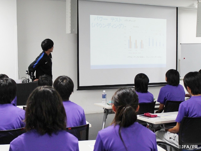 私のこのキャンプでの目標は全力でプレーし、自分の良さを存分に発揮することです。私の長所はスピードを活かしたドリブルや、裏へ抜け出すタイミングとスピードです。全国から高いレベルの人たちが集まってきているので、自分の良さをさらに磨き、個のレベルアップも図りたいです。フィジカルのレクチャーでは、今日練習前に測定し、分析された結果を基に今、自分が将来のためにやらなければいけないことを具体的に考えました。私はYo-Yoテスト(スピード持久性)があまりできなかったと感じたので、今回レクチャーで教わった「継続は力なり」という言葉を心に留め、将来に向けて頑張っていこうと思いました。