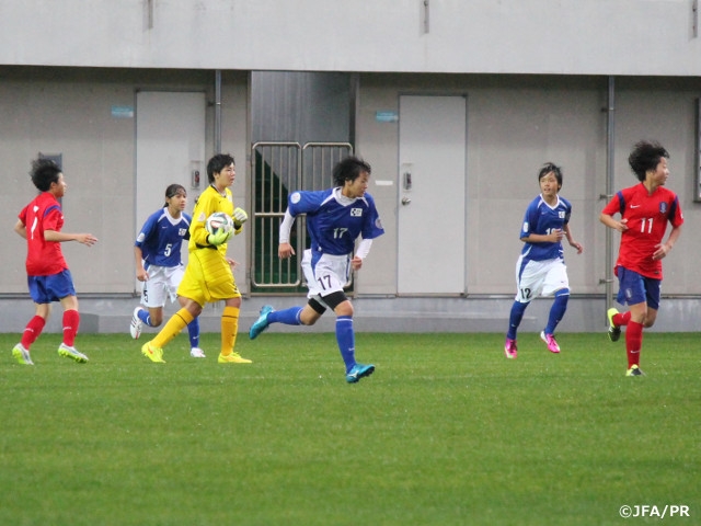 時折激しく雨が降るなか、日本ボールでキックオフ。韓国が勢いとフィジカルの強さを全面に押し出すなか、丁寧にボールをつなごうとする日本が徐々にペースをつかみます。雨のためにスリッピーになったピッチでのボールコントロールに互いが苦しみます。日本は15分、23分に田畑晴菜選手がミドルシュートを狙いますが、いずれも決まらず。27分には右CKからのこぼれ球を拾った片野田朱珠選手のシュートがクロスバーを叩くなど何度か良い形を作りますが決め切ることができません。後半、互いに選手を交代するなか、54分には左CKからゴール正面ペナルティエリア付近に走りこんできた善積わらい選手がフリーでヘディングシュートを放ちますが、ゴール前で守っていた韓国DFに当たり、ゴールを割れず。その後も2度、3度と日本のFW陣が韓国のディフェンスラインの裏に抜けだしてチャンスをつくりかけますが、いずれもオフサイドの判定となり、韓国遠征初戦は0-0の引き分けで終えました。