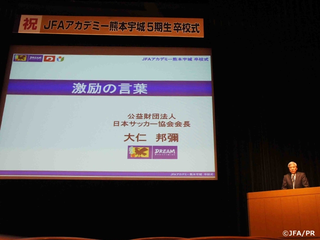 大仁邦彌 日本サッカー協会会長は、今後の活躍に期待を込め、「三年間で学んだJFAアカデミーのフィロソフィーを胸に、培ってきた協調の精神、チャレンジ精神、リスペクト精神を忘れず、これから大きく羽ばたいて欲しい」とエールを送りました。
