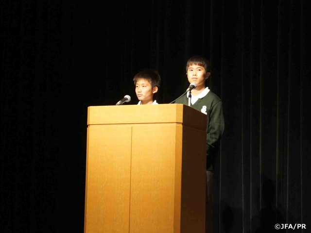 来賓の方々や保護者、所属チーム関係者、在校生が見守るなか、新中学1年生である8期生18名がそれぞれ決意表明を述べました。田嶋幸三 日本サッカー協会会長からは、これからの成長に期待を込め「決意表明でのスピーチを3年間忘れずに頑張って欲しい」と激励の言葉が送られました。