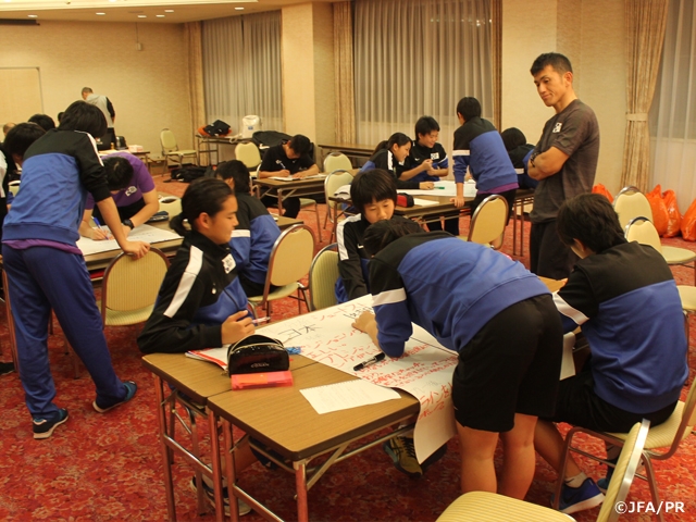 夜に行なったミーティングでは、「U-17女子ワールドカップ 日本×️朝鮮民主主義人民共和国」の試合映像を見ながら、各グループごとにテーマに沿って試合の分析結果をまとめ、皆の前で発表をしました。