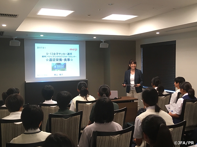 JFAエリートプログラム女子U-13が、今年二回目となる活動を9月1日(金)から開始しました。今回の韓国遠征はJOC日韓競技力向上スポーツ交流事業の一環で、全国から20名の選手が選抜されました。羽田空港に集合した選手・スタッフはオープニングセレモニーに出席し、その後、株式会社明治による海外での食事に関するレクチャーを受けました。韓国到着後は、パジュナショナルフットボールセンターへ移動。翌日からのトレーニング、試合に備えました。