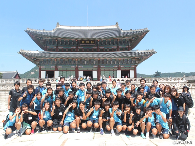 「観て、感じて、行動する」「失敗を恐れずチャレンジする」このふたつの約束の下、選手たちは活動を開始しました。今回、海外遠征が初めての選手たちがほとんどです。将来のなでしこを目指す選手たち。そこにたどり着くためには、オンザピッチだけではなく、オフザピッチの成長も不可欠です。まずは自分で考えて行動する、そのなかで感じたこと(成功と失敗)から新たなチャレンジをする繰り返しです。出発日からを振り返ると、初めは失敗の方が多かったのですが、新たな気づきを得て、知識を学ぶうちに少しずつチームとしても個人としてもよりよい選択ができるようになりました。オンザピッチでも、世界基準のプレーに近づくべく、到着後、二日間で合計3回のトレーニングを行いました。そして3日(日)午後、日韓交流第1戦としてU-13韓国女子代表チームと試合を行いました。ゲームのテーマは、「1vs1」「中盤の攻防」「攻守の切り替え」の3つ。開始2分で先制点を奪い、どちらかと言えば日本のペースでゲームを進めることができ、結果は3-0。選手たちにとっては、初の海外試合を無失点勝利で終えることができました。