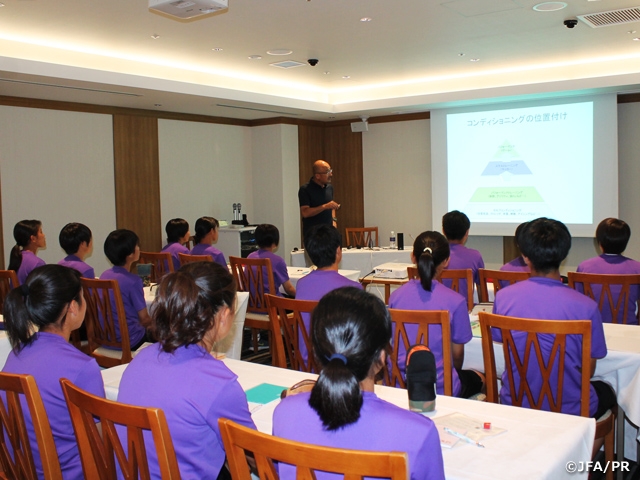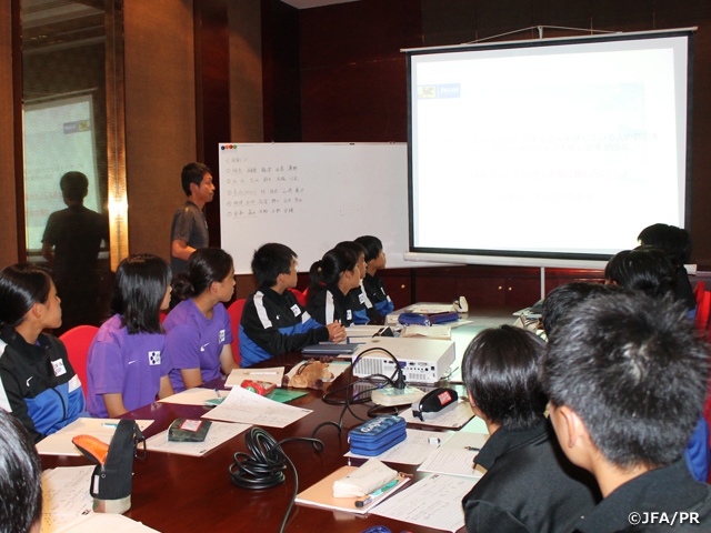 18日に成田のホテルに集合し、エリートプログラム女子U-14中国遠征がスタートしました。初日は、まず最初にこの遠征の目標『CFA International Women’s Youth Football Tournament Weifang 2018で優勝する』と目的『世界のトップレベルのチームとの対戦から有意義な経験を積み、選手個々の能力とチーム力向上を目指す』を選手たちと共有しました。その後、SAMURAI BLUE(日本代表)アスレティックトレーナーの前田弘さんからセルフコンディショニングやオフザピッチでの習慣についてのレクチャーを行っていただきました。FIFAワールドカップロシアでのSAMURAI BLUEの選手たちの様子や話を交えながらセルフコンディショニングの重要性やオフザピッチでの過ごし方・行動・習慣の大切さについて話をしていただき、選手たちはセルフコンディショニングやオフザピッチでの習慣がそのままオンザピッチでのパフォーマンスに繋がっていることを深く理解することができ、大変貴重な時間となりました。最後にエリートプログラム女子U-14での約束やコンセプトをみんなで共有し、初日の活動を終えました。