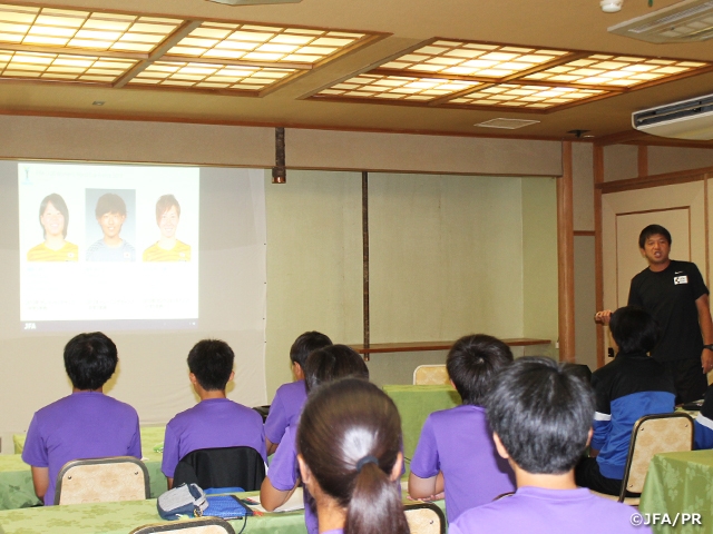 夜のミーティングでは、選手一人ずつ自己紹介を行ったあと、8月に開催されたFIFA U-20女子ワールドカップ フランス2018で優勝を果たしたU-20日本女子代表チームでGKコーチを務める西入俊浩コーチから、映像を交えて大会の様子や、U-20チームのGKについて紹介がありました。