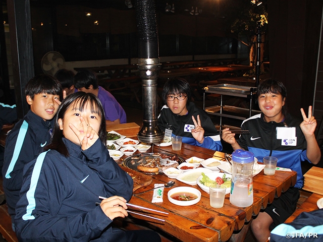 遠征5日目の午前は雨のため、トレーニングを中止し、映像を見ながらみんなで1試合目を振り返りました。良かった点は、自陣では相手を見ながら効果的なビルドアップが出来たことです。課題としては、ビルドアップの際のパススピード、守備の際はボールを奪い切るアプローチをすること、攻撃はシュートで終わろうという3点です。韓国との2試合目は、1試合目で良かった部分を継続させ、3つの課題にはこの試合で改善できるようにトライしようという話をしてピッチに送り出しました。キックオフから主導権を握り、何度も相手ゴールに迫り、シュートで終わる場面も1試合目に比べて多くなりました。守備面では予測を持ったアプローチからボールを奪い、相手に攻撃の起点を作らせない守備ができました。攻守の切り替えの速さは特に良かった点として挙げられます。終わってみれば5-1と相手を圧倒して勝つことが出来ました。安定したビルドアップから攻撃に繋げる点はこちらに来てから課題として繰り返し取り組みましたが、韓国との対戦は2試合ともにはっきりとした向上が見られました。短いトレーニング期間にもかかわらず、課題改善を可能にした選手の理解力の高さには目を見張るものがありました。この遠征を通し、選手一人一人が様々な体験をしました。初めて経験することにも積極的に取り組むことで得たものも多かったと思います。こういった学びの姿勢は今後のどんな活動にも活きてくるはずです。次回のエリートプログラムではオン・オフ両面での成長した姿に期待します。
