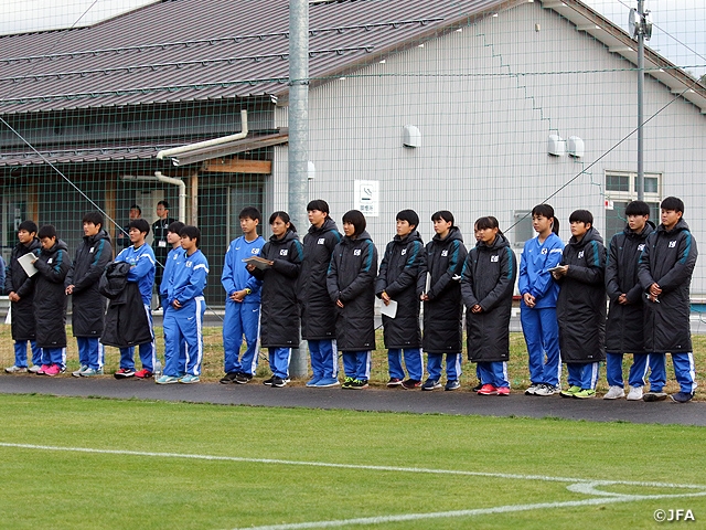 女子GKキャンプ初日は、なでしこジャパンのトレーニング見学という機会に恵まれました。選手たちは目標としているなでしこジャパンのGKトレーニングをピッチ脇で観ることができました。選手たちを事前に6グループに分け、3人の代表GKのプレー分析をするように伝えており、グループで話し合いながら見学していました。トレーニング終了後には、その3人が特別に選手たちを激励してくれました。また、なでしこジャパンGKコーチの大橋コーチからも攻撃参加について助言をいただき、さらに意欲が高まったように感じました。最後に高倉監督からも「みんなにもチャンスがある」と声をかけていただき、選手たちはさらにモチベーションが高まりました。個人的には、福島県出身の監督の下で、福島県出身の遠藤選手がトレーニングしている様子を観ることができ、福島県出身の私としては非常に感慨深いものがありました。ミーティングでは、今回のトレーニングの分析について、与えられたテーマについて発表を行いました。今までのキャンプの積み重ねが生かされており、プレーの前、プレー、プレーした後の局面に分けて分析をし、わかりやすく発表していました。今回の分析結果が必ず明日からのトレーニングに生かされることと思います。このような機会を設定していただいた関係者の皆様に感謝申し上げます。誠にありがとうございました。