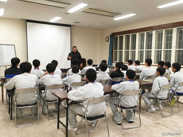 初日は寒空の下でのトレーニングでしたが、選手たちは積極的に練習に取り組みました。夜のミーティングでは和泉監督、池内ユース育成ダイレクターから多くの刺激が与えられ、選手たちは真剣なまなざしで講師の話を聞いていました。
