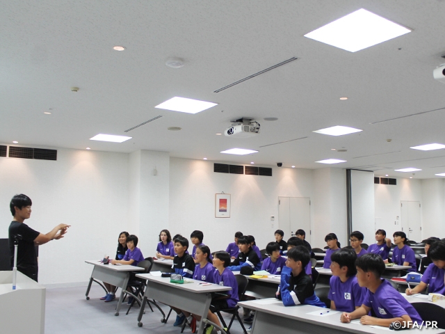 夜のミーティングでは、一人ずつの自己紹介を行い、自分自身を仲間に知ってもらえるようそれぞれの言葉でスピーチしました。また、その後はGKのプレーについてのレクチャーがあり、GKの役割等を学びました。