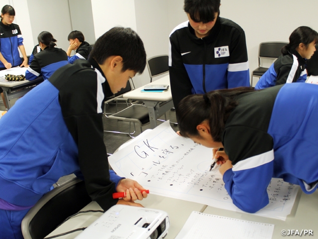 キャンプ2日目の12月1日(日)には、大阪学芸高校とトレーニングマッチを実施。40分×2本を行い、1本目を2-0、2本目を0-0とし、トータル2-0で勝利しました。また、夜のミーティングでは、ポジションごとにグループを作り、各ポジションの役割について話し合い、発表を行いました。その後、狩野倫久コーチより、自身が監督を務めるU-16日本女子代表チームの取り組みについての話があり、選手たちはそれぞれの思いを胸に、多くのことを考える時間となりました。